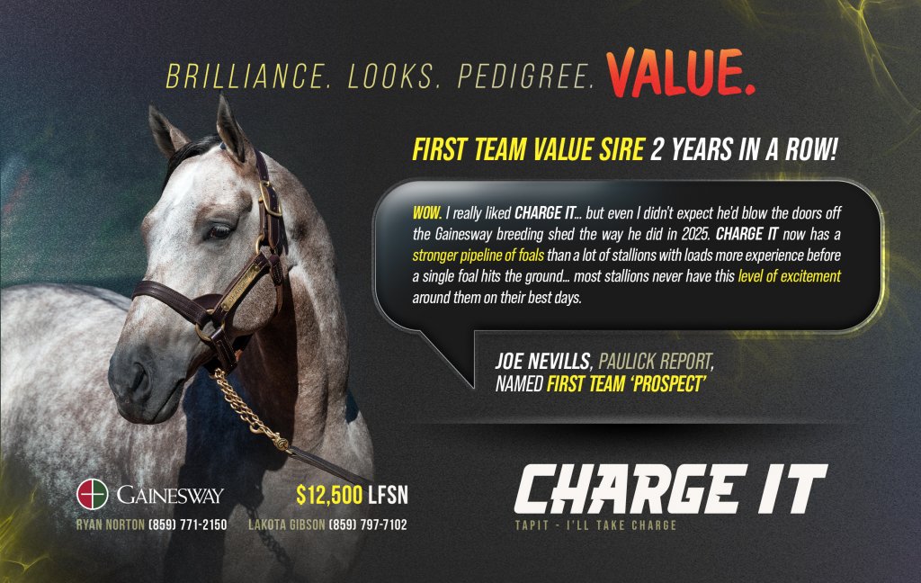 CHARGE IT garners immense support from Bloodstock Experts in the All-Value Sire Team Series by Paulick Report