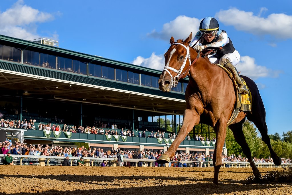 Locked (9), ridden by Jose Ortiz, wins the Breeders Futurity (Grade 1) on Coolmore Turf Mile Day at Keeneland Racecourse in Lexington, Kentucky on October 7, 2023. Tere Poplin/Eclipse Sportswire/CSM
